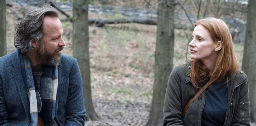 W Pamięci partneruje jej Peter Sarsgaard, przejmujący najmroczniejszą rolą z Boys don’t cry 1999 (tam partnerujący Hilary Swank i jej pierwszej oscarowej roli) i prawie tak samo odrzucający w serialu Presumed Innocent (2024) z Jake’em Gyllenhaalem (swoim wieloletnim przyjacielem i szwagrem od 24 lat).
